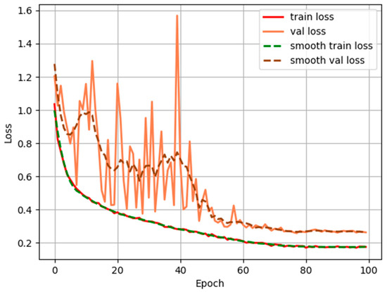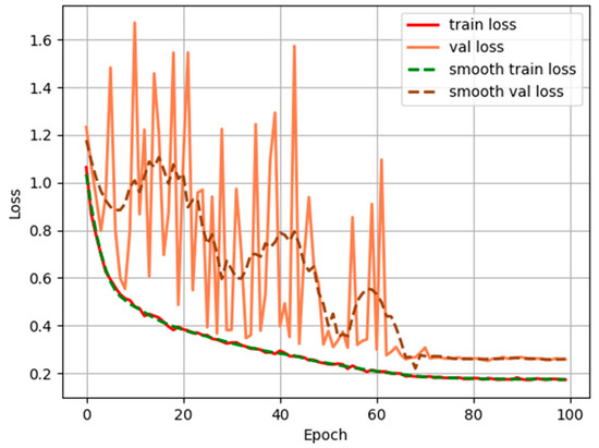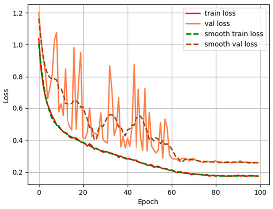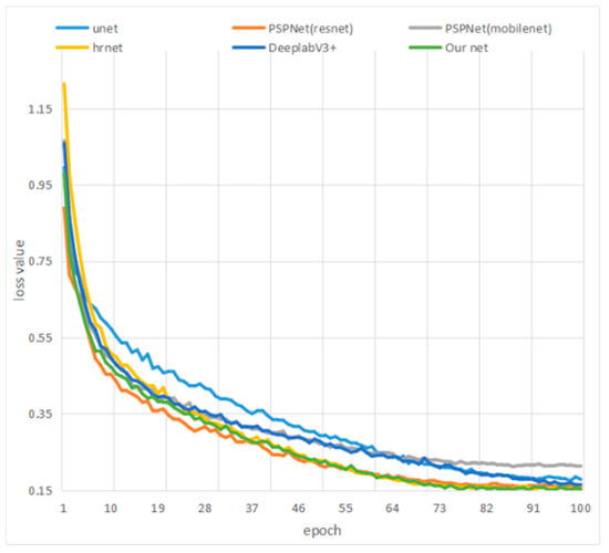 In the channel attention module of CBAM, there is a channel multiplier parameter, also known as the dimension reduction coefficient. This parameter first reduces the total number of feature channels and then enlarges them back to the initial number of channels. This process helps reduce computational parameters but can also affect the final recognition performance. Therefore, this paper conducted comparative experiments with channel multipliers of 5, 8, 12, and 16. As shown in the Table 4, when the CBAM channel multiplier is 8, the MIOU and MPA reach 71.22% and 85.72%, respectively, which is an improvement of 1.97% and 1.72% compared to the original multiplier of 16. Overall, the CBAM attention mechanism performs best when the channel multiplier is set to 8 for model recognition performance. The training loss variation with epochs is depicted in Figure 11, showing gradual convergence after 70 epochs.