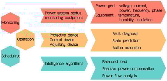 The smart transmission grid enables real-time monitoring and control of power grid status, power quality, and power load through high-speed, high-bandwidth communication networks, thus achieving automated operation and management of the power grid. Additionally, smart transmission technology facilitates long-distance power transmission while minimizing losses []. A smart transmission network comprises multiple interrelated and interdependent components, functionally categorized into monitoring, operation, and scheduling, as shown in Figure 1. This structure enables automation, intelligence, and efficient management of the power system [].