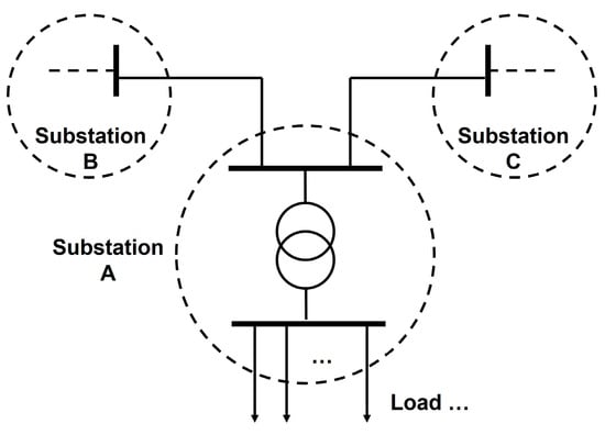 Figure 2 illustrates the substation area network model. Assume Substation B is a 220 kV substation serving as the power supply terminal, Substation A is a 110 kV substation serving as a connecting substation, and Substation C is a 110 kV substation serving as the receiving end of the network. Using Substations A and Substations C as examples, this paper proposes a fault identification method for smart grid protection systems based on circuit breaker phasor information.