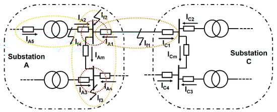 Figure 3 depicts the single-line diagram connecting Substation A and Substation C. Both of them employ a single bus segmentation method on their 110 kV sides. IA1, IA2, IA3, IA4, IC1, IC2, IC3, IC4, IAm, and ICm are the measured secondary current values of the current transformers at the corresponding circuit breakers. Applying Kirchhoff’s current law to these parameters, the sum of currents flowing into each bus during normal operation equals zero. This yields the following current relationships for the 110 kV side of Substation A: