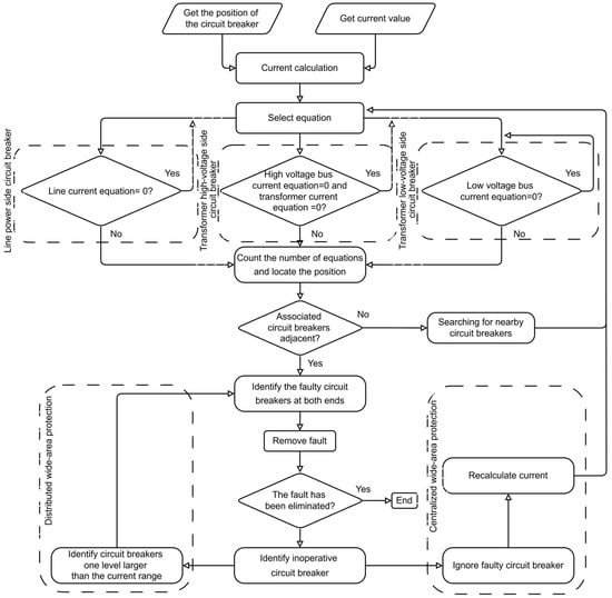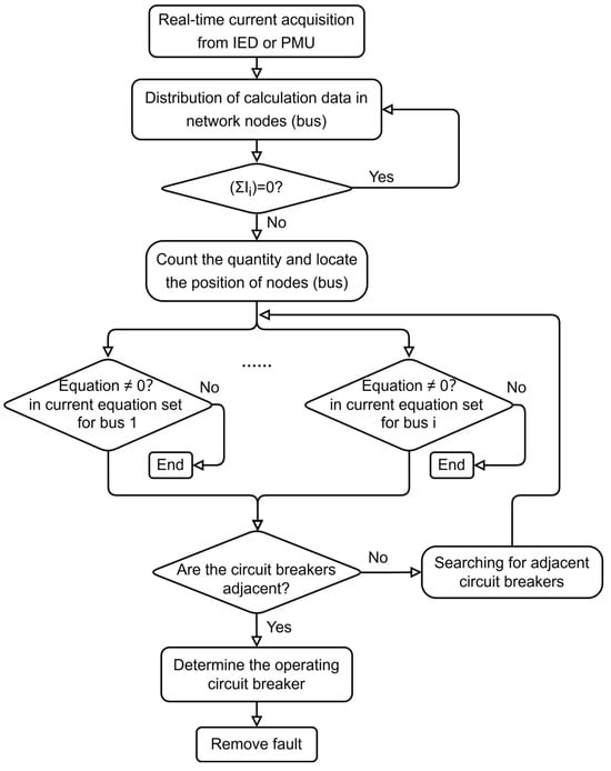 These assumptions demonstrate that each fault area is enclosed by circuit breakers. In smart grids, each circuit breaker is equipped with a PMU or IED that measures all currents entering the potential fault zone. When a fault occurs in an area, the total incoming current increases significantly compared to pre-fault conditions. Consequently, an area is designated as the fault zone if the sum of its currents exceeds a predefined threshold. During a fault, the current difference at circuit breakers on both ends of the fault changes, while other circuit breakers show no significant changes. However, multiple circuit breakers within the same area may exhibit changes in current difference. To minimize the fault impact, the operational status and relative positions of circuit breakers must be considered to ensure only adjacent breakers operate, preventing overstepping tripping. Therefore, we propose a fault diagnosis method based on current difference. This method incorporates wide-area monitoring information exchange, extends beyond protection equipment, and coordinates the action time and sequence of circuit breakers at the network level. Figure 4 illustrates the workflow of this method.