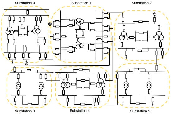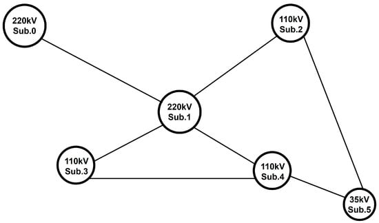 The power grid in a certain county area is a complex power transmission and distribution system composed of multiple substations and transmission lines, as shown in Figure 10. Its core is a 220 kV substation (Sub.1), which serves as a crucial power transmission hub. Sub.1 receives power from another 220 kV substation (Sub.0), establishing a robust power network. Sub.1 distributes power to three 110 kV substations (Sub.2, Sub.3, and Sub.4) and supplies power to surrounding users and substations via transmission lines. Additionally, Sub.2 and Sub.4 connect to a 35 kV substation (Sub.5), which further steps down power for distribution to local small-scale industrial and residential areas.