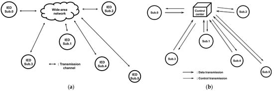 Protection system structure. (a) Decentralized structure; (b) Centralized structure.