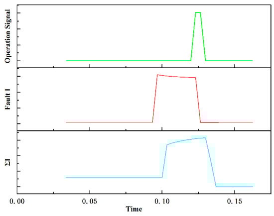 The performance of the scheme for fault F1 is shown in Figure 13. The graph shows that after the fault occurs, the current sum of the core protection circuit breaker B.1TM1 changes significantly. Based on the current equation, the system issued a trip command within 30 ms, successfully isolating the fault. This response indicates the protection system’s correct operation and effectiveness.