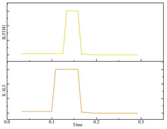 The performance of the scheme for fault F2 is shown in Figure 14. It shows a change in the current sum of the core protection circuit breaker B.4L5 following the fault occurrence. Based on the current equation analysis, the system issued a trip command within 0.2 ms. However, due to the failure of the circuit breaker in Sub.5, the backup protection mechanism was immediately activated. Ignoring the circuit breakers of the line in Sub.5, changes were observed in the current sum of both B.4L5 and B.5TH1 core protection circuit breakers. The current equation analysis yielded consistent results for both, leading to an immediate trip command issuance, which successfully isolated the fault within the minimum range.