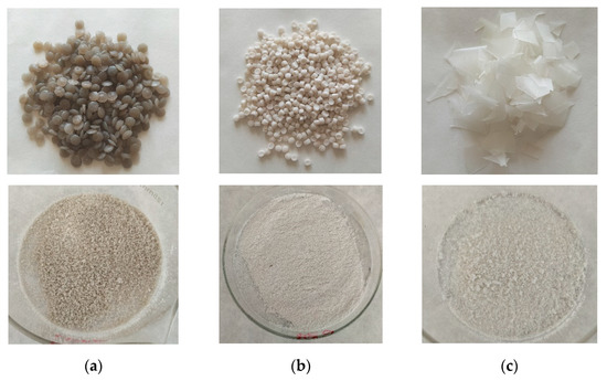 LDPE (a), PVC (b) and PVB (c) waste granulates used in the tests: upper photos—original regranulates from mechanical recycling, lower photos—ground material for blending in presumed proportions.