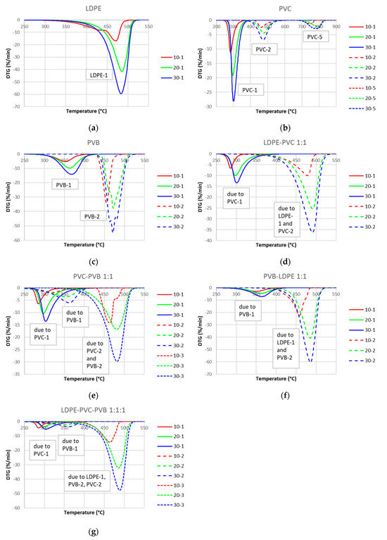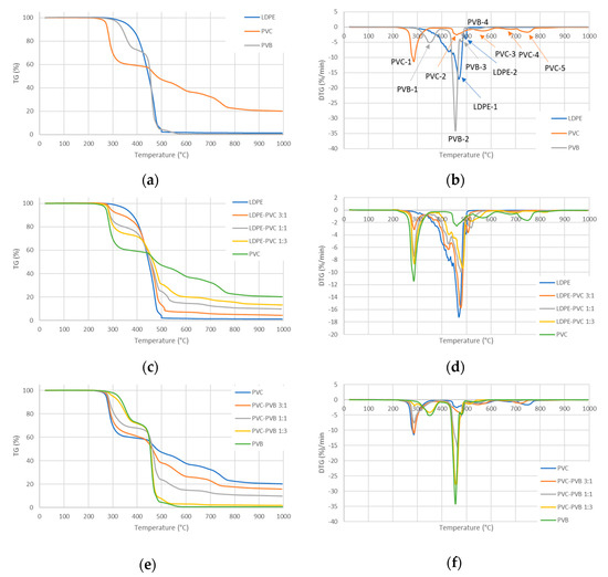 Figure 3 presents TG/DTG curves for LDPE, PVC and PVB, and their binary and ternary mixtures at a heating rate of 10 °C/min, respectively. The DTG curve for LDPE (Figure 3b) reveals one large peak at 469 °C (designated LDPE-1) and a much smaller one around 497 °C (LDPE-2). The first peak is related strictly with LDPE pyrolysis [54], whereas the second one is probably a result of unidentified admixtures mentioned at the beginning of Section 3.1. The DTG curve for PVC waste shows one large peak, 286 °C (PVC-1), and four smaller ones (461, 568, 678 and 748 °C, denoted PVC-2 to PVC-5, respectively). Among them, peak PVC-1 corresponds to C-Cl bond cleavage and vaporization of HCl [25], and peak PVC-2 (461 °C) is related to further degradation of the PVC chain and creation of aromatic rings [55], whereas further peaks originate probably from specific admixtures. Peak PVB-1 (349 °C) in the DTG curve is related to elimination of water from vinyl alcohol copolymer with formation of small amounts of butanal [56] and the presence of a plasticizer in the PVB waste sample [57], whereas peak PVB-2 (455 °C) corresponds to the side group elimination and main chain scission [56,57]. Two smaller peaks, PVB-3 (478 °C) and PVB-4 (547 °C), show the presence of unidentified admixtures.