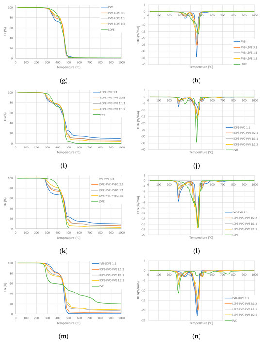 The pyrolysis temperature ranges for LDPE, PVC and PVB are 230–511 °C, 217–876 °C and 237–584 °C, respectively. PVC pyrolysis started at the lowest temperature and finished at the highest one, whereas LDPE pyrolysis started at the highest and finished at the lowest temperature. Compared to LDPE and PVB, PVC had a wide range of thermal decomposition temperatures, which is consistent with the results reported by [58,59]. Differences in the molecular structures of these materials significantly influence the thermal degradation process. The mass loss for LDPE and PVB was very high and reached around 99%, whereas it reached only around 80% for PVC. Hence, it follows that LDPE and PVB pyrolysis is nearly complete and occurs in a relatively narrow range of temperatures, whereas PVC pyrolysis is not full and requires a wide range of temperatures. The binary (Figure 3c–h) and ternary mixtures (Figure 3i–n) show TG/DTG curves approximately being blends of those for the main components. The differences between expected and observed TG/DTG curves for the blends are discussed in Section 3.4.
