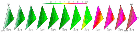 Since it is difficult to gain an overall view on the pyrolysis process using separate TG curves, they were used to prepare snapshots of a processed percentage for any mixture of LDPE:PVC:PVB. Each triangle in Figure 4 represents one moment in time and an approximate value of temperature. Each point in the triangle corresponds to certain proportions of LDPE:PVC:PVB, equal to the barycentric coordinates of that point (pure components are represented by vertices, binary blends are represented by the triangle sides, and ternary blends—by the interior of the triangle). The snapshots were prepared for temperatures 300–500 °C, in which almost all mass is processed. It is visible that the pyrolysis starts first for PVC, then around 340 °C, the PVB pyrolysis starts, and around 440–460 °C, the LDPE-PVB blends are intensively processed so that around 500 °C, nearly 100% of LDPE, PVB and their blends are used, whereas a significant part of samples containing larger amounts of PVC remains unprocessed. The contours in the snapshots for temperatures below 400 °C and above 460 °C are nearly straight, indicating that the pyrolysis in that range of temperatures is approximately a simple superposition of used components. However, for 400–460 °C, the contours are not straight; therefore, pyrolysis of the blends in that temperature range is more complex.