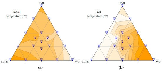 The initial temperature, final temperature, total mass loss and average mass loss rate are presented in triangular plots illustrating the effect of LDPE, PVC and PVB share (Figure 5). The initial temperature of pyrolysis is lowest for PVC and rises as the share of LDPE or PVB grows. In turn, the final temperature is highest for PVC and drops as the share of PVC decreases. As for the total mass loss, it is lowest for PVC and grows as the share of PVC decreases. As a result, the average mass loss rate is lowest for PVC and highest for LDPE. It is visible that mass loss at 500 °C for LDPE and PVB is nearly 100%, whereas it is only 53% for PVC (Figure 5d). The lower thermal degradation efficiency of the PVC sample indicates a greater production of a gaseous product during the pyrolysis of this material, most likely as a result of the de-chlorination process, which causes the release of more gas instead of a liquid product [21,60].