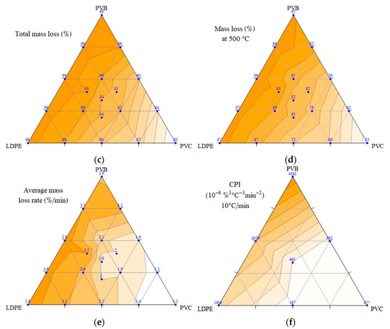 Overall parameters of the pyrolysis process vs. LDPE, PVC and PVB share at a heating rate of 10 °C/min (boundaries of the zones obtained by linear approximation between data points): (a) initial pyrolysis temperature, (b) final pyrolysis temperature, (c) total mass loss, (d) mass loss at 500 °C, (e) average mass loss rate, and (f) influence of LDPE, PVC and PVB contribution on CPI (values in %3 °C−3min−2 × 10−6).