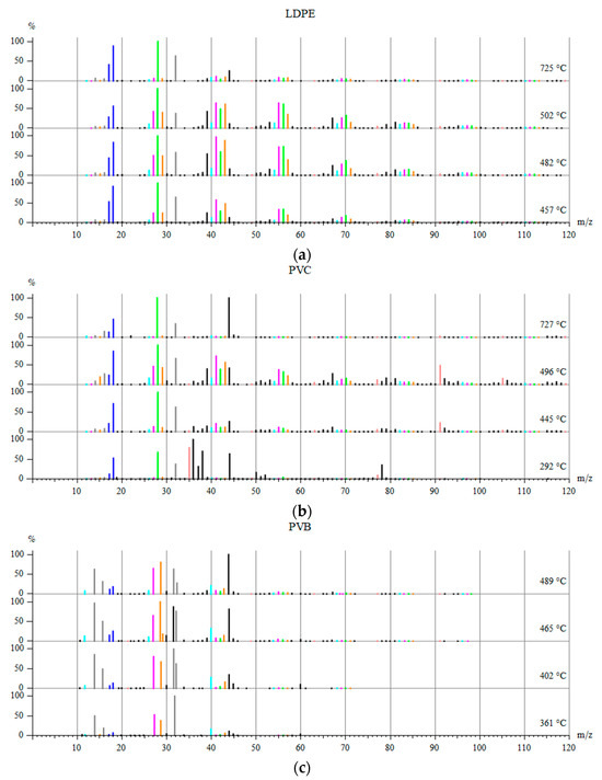 The pyrolysis of LDPE leads to the production of various hydrocarbons with one to several dozen carbon atoms [54]. A similar situation takes place for PVC, but the fragments often contain chlorine atoms. PVB can contain three types of monomers: most abundant vinyl butyral -CH2-CH(C2H5O2CH-C3H7)-, vinyl alcohol -CH2-CHOH-, and vinyl acetate -CH2-C2H3O2- of less abundance [48]. The much more complicated structure of the PVB chain makes it possible to produce compounds such as C3H7COOH, C4H9OH, C3H7COH, CH3COOH and others [61]. It should be noted that the used samples were prepared from waste, therefore the samples can contain plasticizers as well as other compounds which are difficult to identify. Nevertheless, the above-mentioned fragments were identified in mass spectra as shown below (the interpretation was based mainly on [62,63] unless otherwise indicated). Figure 6 shows the mass spectra for the used LDPE, PVC and PVB at specific temperatures.