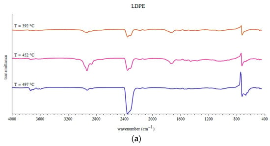 FTIR spectra of gaseous products at various temperatures during pyrolysis of used waste LDPE (a), PVC (b) and PVB (c).