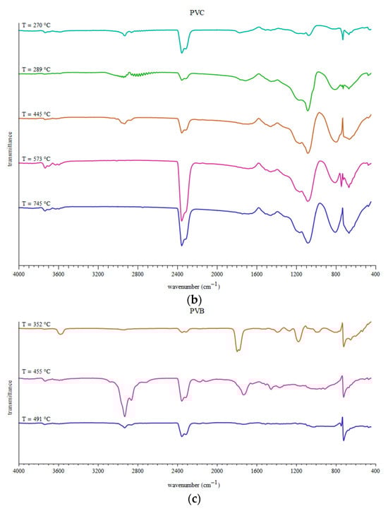- A series of oscillations in region 3100–2600 cm−1 visible for samples containing PVC for temperatures 250–350 °C (Figure 7b) show H-Cl stretching modes [32].