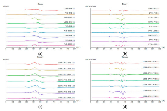Figure 8 show plots of ΔTG and ΔDTG given by Equations (3) and (4) for binary and ternary mixtures of LDPE, PVC and PVB. Most ΔTG curves are above zero for temperatures less than around 450–470 °C, whereas below zero for larger temperatures. This means that the synergy effects for mass loss is positive in the initial stage of pyrolysis and negative in the further stage. However, samples PVC-PVB 1:1, PVB-LDPE 1:3, LDPE-PVC-PVB 1:1:1, 1:1:2 and 1:2:2 manifest negative synergy effects for temperatures up to 350–370 °C, and even to 440 °C for PVC-PVB 1:1. As for synergy in mass loss rate, the effects are variable, but in the temperature range of 350–450 °C they are mostly positive, which indicates a significant interaction of polymers in these temperatures.