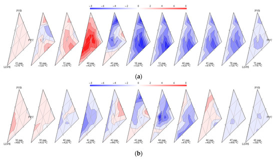 To obtain a more comprehensive image of the synergy, a series of triangular plots of ΔTG for individual times was prepared (Figure 9a). The most dynamic changes in ΔDTG occur for temperatures around 400–500 °C; therefore, Figure 9b shows plots of ΔDTG in this temperature range. Each triangular plot represents synergy effects at a certain time, and each point in the triangles represents an individual sample, in which contributions of LDPE, PVC and PVB are equal to the barycentric coordinates of that point. The red color corresponds to positive values of ΔTG and ΔDTG, i.e., positive synergy effect, whereas the blue color corresponds to negative values. In the initial stage of pyrolysis up to temperatures around 450 °C, the mass loss is usually accelerated compared to the prediction (red regions). This effect may be regarded as positive because a higher conversion rate is obtained quicker for mixtures than for pure components.