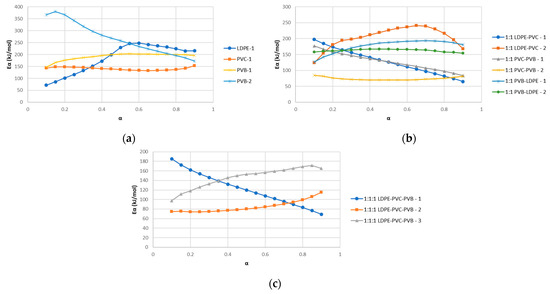 Activation energy vs. the degree of conversion: (a) activation energy for LDPE, PVC and PVB peaks, (b) activation energy for 1:1 binary mixtures, and (c) activation energy for ternary 1:1:1 mixture peaks.