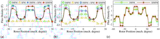 Normal flux density distribution: (a) the effect of each PM is individually considered; (b) there is a gap in the stator middle teeth to prevent the slot PM’s flux short circuit; (c) comparison between the SIMPM and IMPM.