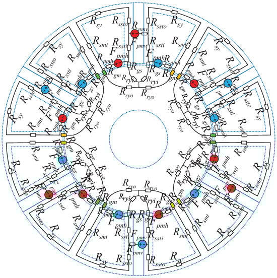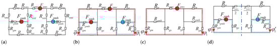 Having established the ineffectiveness of the superposition principle in analytically exploring this operational principle, an alternative mathematical approach is required to differentiate between SIMPM and IMPM. Figure 2c illustrates how the flux density under one stator module significantly differs from its neighboring modules. The magnetic equivalent circuit (MEC) of the structures is shown in Figure 3. This diagram provides an overview of various reluctances influenced by the saturation effects of inter-modular magnets. Simplifying this circuit, we can isolate an individual module, as shown in Figure 4a. A more streamlined perspective into the magnetic circuit is presented in Figure 4b by eliminating certain core reluctances. Once the magnetic circuit is established, the impact of each PM can be studied under a specific condition: the SPMs undergo variable reluctance adjusted by the inter-modular magnets. Figure 4c,d display this condition, providing a nuanced understanding of the magnetic interactions within the structure.