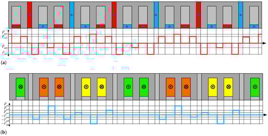 To examine distinct harmonic orders in the SIMPM topology, the flux modulation theory is applied, isolating PM-MMF and armature MMF, as depicted in Figure 5. Each structure adjusts the primary PM-MMF and armature MMF using stator and rotor teeth, and the values of (), (), (), (), (), (), and () shown in Figure 5 are calculated. Employing a fast Fourier transform (FFT) and leveraging the evident even symmetry in Figure 6a, the primary PM-MMF of the SIMPM can be formulated, as illustrated in (4). Notably, the Fourier coefficient () of the SIMPM differs from the IMPM configuration, as the asymmetric-biased-flux operation introduces an additional DC term ().