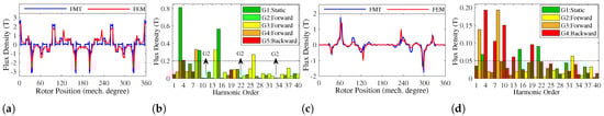 (a) SIMPM’s normal flux density for PM-only-enabled condition, (b) its FFT, (c) IMPM’s normal flux density for armature-only-enabled condition, and (d) its FFT.
