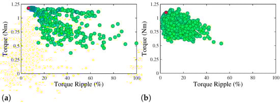 Figure 7 delineates the optimization parameters utilized for both configurations. Employing random search algorithms and multi-objective optimization techniques, the objective is to augment torque density while concurrently minimizing torque ripple in the structures. Notably, the optimization process places a premium on enhancing torque density. In this research, a genetic algorithm (GA) is used to optimize the motors. The cost function or objective function is defined as shown in (9).
