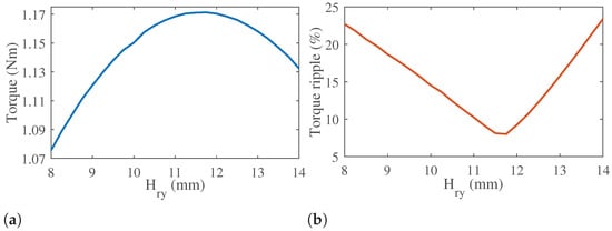 Effect of different rotor yoke thicknesses on the (a) average torque and (b) torque ripple.