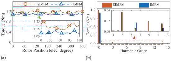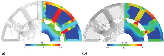 Figure 12 illustrates the magnetic flux density distributions of the presented SIMPM at a rated current density of 6 A/mm2 and a speed of 900 rpm. Figure 13 displays the full-load torque profiles. The proposed structures produced approximately 9% more average torque compared to the IMPM. This is because of the flux concentration of the PMs and increased effective harmonics. In other words, reluctance torque is negligible.