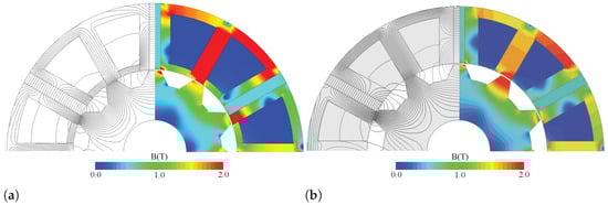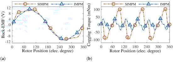 The magnetic flux density distributions of the presented structures under no-load conditions are depicted in Figure 10. It is evident that neither of the motors experiences global saturation. Notably, the flux line representation in Figure 10 illustrates that the SIMPM effectively directs the PM flux towards the air gap, thereby amplifying torque density. The back-EMF waveforms for the motors are displayed in Figure 11.