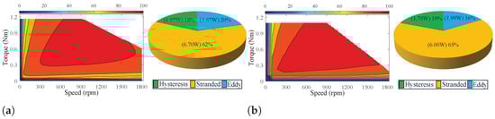 Figure 15 also shows the efficiency maps of the two structures. SIMPM topology has an increased torque-speed region compared to the conventional IMPM. On the other hand, the high-efficiency region of IMPM is a little more extended than SIMPM. This resulted from reduced core loss due to the absence of slot PMs.