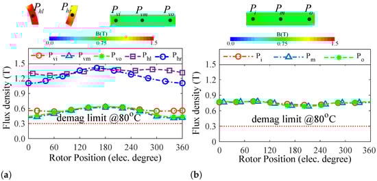 The demagnetization state of the proposed SIMPM is analysed, as depicted in Figure 16a. Notably, none of the PMs approach the demagnetization region of NdFeB-42. It can be seen that both motors’ PMs are far from the irreversible demagnetization region [26].