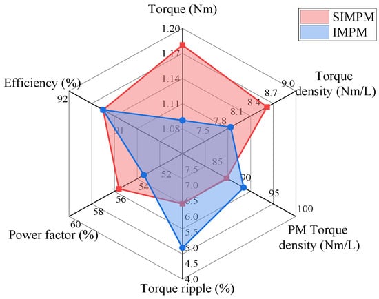 Figure 17 summarizes the comparison between SIMPM and IMPM. This shows that, due to the insertion of slot PMs, the torque per PM density has decreased for the SIMPM. However, the torque density has increased by approximately 9%. The other difference lies in the power factor in which the SIMPM takes the lead compared to the IMPM because of higher back-EMF and lower magnetic reluctance.