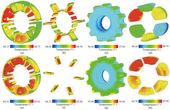 Thermal analysis: (a) SIMPM’s stator, (b) SIMPM’s PMs, (c) SIMPM’s rotor, (d) SIMPM’s coils, (e) IMPM’s stator, (f) IMPM’s PMs, (g) IMPM’s rotor, (h) IMPM’s coils.