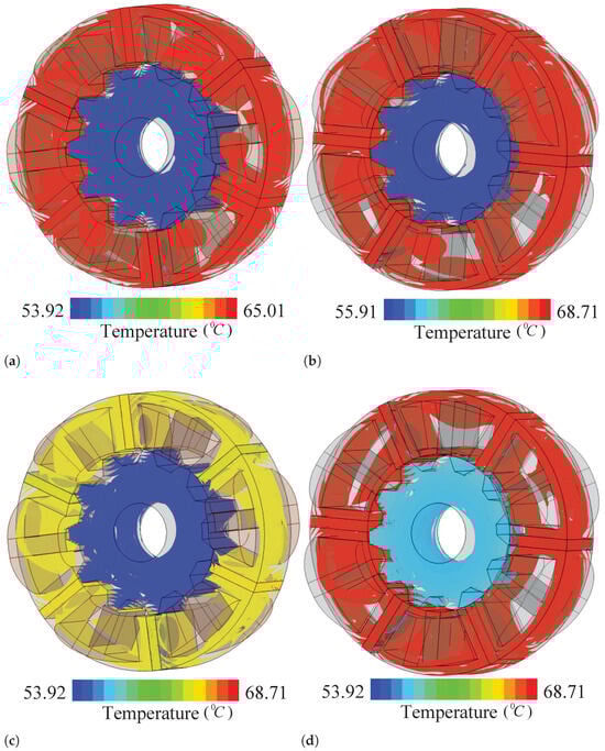 Thermal analysis results in a common scale for (a) IMPM motor and (b) SIMPM motor. (c) IMPM and (d) SIMPM thermal analysis results with the same range.