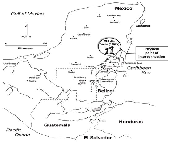 This figure shows a regional map of northern Central America, including Mexico, adapted from Guderjan et al. [14], whereby the authors highlighted the 115 kV transmission line extending from point 1 (Xul-Ha, Yucatan Peninsula, Mexico) to point 2 (West Lake, Belize) that interconnects the power grids of both countries.