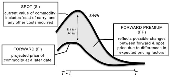 The efficient market hypothesis [21] in financial economics suggests that the commodity price incorporates all available market information and fosters trading at fair value in the absence of market inefficiency. However, empirical studies have identified information asymmetry in electricity prices [22], making some power markets less efficient. Consequently, it is important for small participants like Belize, who would be more exposed to asymmetric information, to understand the inefficiencies often embedded in pre-determined forward and spot pricing. Figure 2 presents a relationship of spot and forward pricing, highlighting how differences in expected pricing factors influence the level of basis risk.