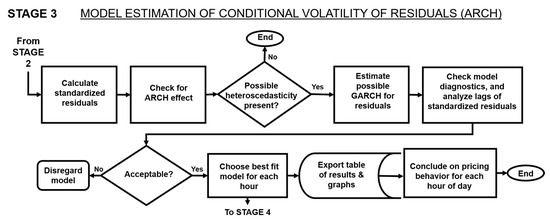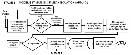 Model estimations (Stage 2), depicted in Figure 4, were used to draw generalized data-driven conclusions on each market’s characteristics and to develop a model for predicting electricity prices. This study applied a series of ARMAs (autoregressive moving averages) [28] for each hour of the day to construct an acceptable mean model of the historical price data, based on fundamental factors of electricity, with separate models for the forward and spot prices.