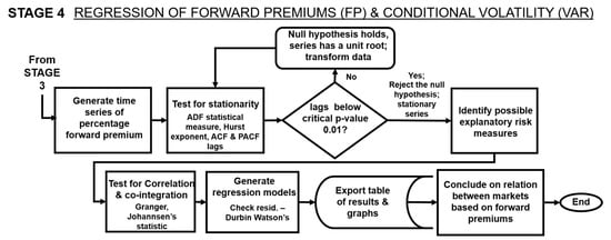 Investigating the relationship between the forward premium and price risk factors associated with the Xul-Ha node using a series of hourly VAR (vector autoregression) models occurred in Stage 4 and is depicted in Figure 6. Assessment was performed on four risk factors, including the volatile tendencies and spikes specific to the forward and spot pricing, and variables reflecting potential effects on the nodal condition due to the buyer’s consumption activity.