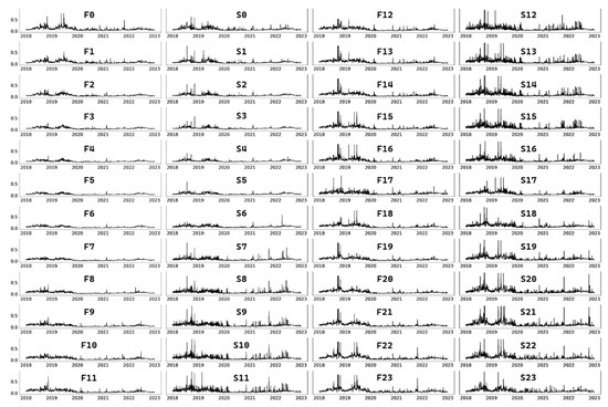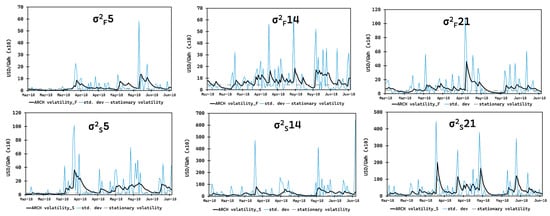 In total, the study evaluated four risk variables. Following previous studies that performed similar empirical analyses on electricity prices, including [19,20,48] and past findings on Mexico’s SIN, our study determined that the pricing volatilities appropriately reflected real-time corrections of congestion, operating reserves, and transmission losses [26] by the supplier. Consequently, the time series of the simulated GARCH volatilities of the standardized residuals of spot and forward price changes, σ2S and σ2F, respectively, were chosen as the first two components to reflect the uncertainties associated with the supplier’s operations and system conditions at the Xul-Ha node.