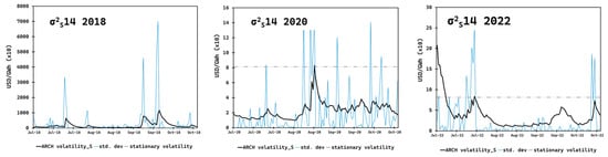 Figure 8 and Figure 9 provide depictions of sample hours of identical periods and comparative years for these simulations relative to the actual calculated volatility and stationary volatility. Stationary historical volatilities based on the value of standard deviation were estimated to measure the dispersion of daily fluctuations from 2018 to 2022 (a useful indicator for assessing risk over time and comparing it to dynamic volatilities generated by the estimated models).