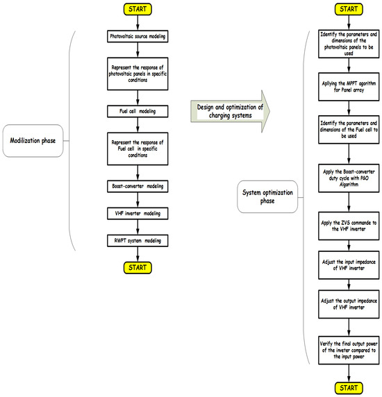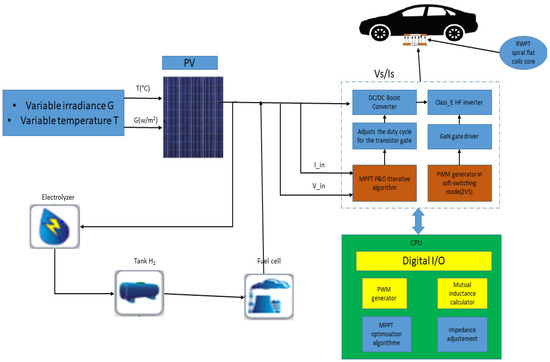 The wireless charging system designed for EVs comprises three main components. The initial block integrates the solar generator, the hydrogen fuel cell, and the Tunisian electricity grid, comprising a PVP, a fuel cell, and the grid station, and utilizing a boost converter to enhance performance. In addition to that, the subsequent block concerns the resonance structure, as symbolized by one class-ϕ2 inverter. Ultimately, employing flat spiral coils, the wireless transformer is included in the last block.