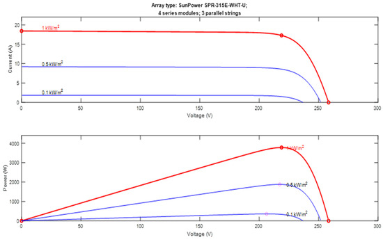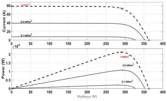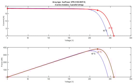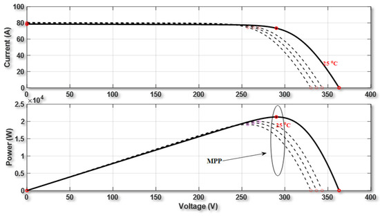 I- (current-voltage) and P-V (power-voltage) characteristics of the array presented under conditions of 1000 W/m2 irradiance and specific temperature.