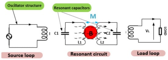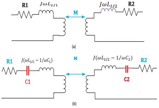 When the coils are loosely coupled, the inductance becomes significant. To counteract or nullify the influence of this leakage inductance, a capacitor can be inserted in series. Let us examine two coils that are magnetically linked, as represented in Figure 7a. In one system with loose coupling, the leakage inductance can surpass the mutual inductance. As a result, the leakage reactance (LLI) impedes the current flow to the output, particularly at elevated operating frequencies (where f = ω/2π). By introducing a series capacitor and tuning it to the LC resonator frequency (f0), as depicted in Figure 7b, the leakage reactance can be compensated for while effectively reducing the impedance along the energy path from the source into the circuit.