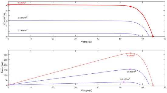 I-V (current-voltage) and P-V (power-voltage) characteristics of the array graphically illustrated at a temperature of 25 °C and variable solar radiation.