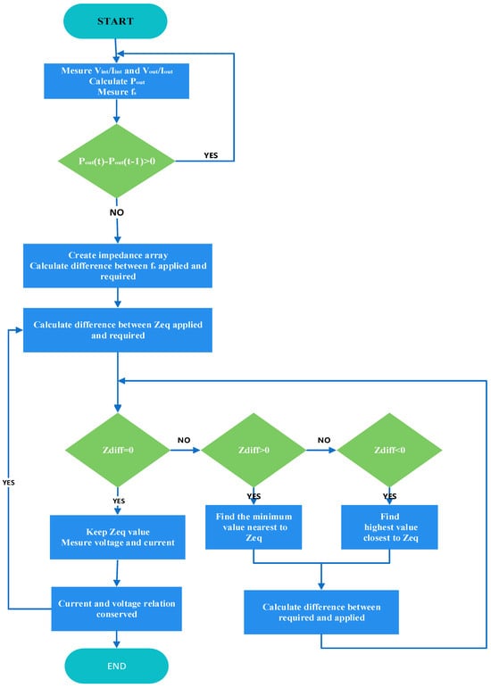 To provide comprehensive guidelines for designing the resonant characteristics of class-Ф2 conducted on the resonant parameters of the inverters undertaken to investigate the modeling techniques specific to this class and to minimize the resonant current for analyzing the magnitude and conduction losses in resonant power converters, we have developed one analytic modeling approach for class-Ф2 inverters. Indeed such a method involves altering the inverter’s input impedance, while simultaneously overly employing one variable impedance (Zeq) with the purpose of tailoring and adjusting the resonance parameters and considering key factors like the control signal emanating from the transistor response, the network signal quality, and the DSP or driver module, as illustrated in Figure 17 and Figure 18. The capacitance at the output of the gallium nitride (GaN) transistor, often denoted as (Ct), is proportionally related to the condition Ct < Coss, relative to the operating frequency of the inverter. The operational duration and manufacturing deviations of the transistor impact the (Coss) internal capacitance and, as a consequence, the overall system, necessitating careful consideration in the Ct selection. Figure 18 outlines the algorithm for optimizing the class-Ф2 inverters’ operating mode using a capacitor array with the target of adjusting Ct optimally for Pout_max. Additionally, optimization trials between the RWPT system and the class-Ф2 inverters involve adjusting optimal operations achieved by balancing the input capacitance of RWPT (Cin) and the output capacitance of the inverter (Cz) for attaining the maximum power at the secondary coil terminal (Pout_max) while minimizing losses (Ploss_min).