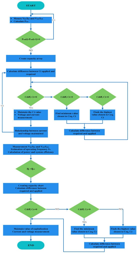 The capacitance value attributed to the output of the transistor (Ct) should be directly corresponding to the inverter’s operating frequency (Fs). Ct must adhere to the Ct < Coss condition, considering the influence of the operating time and manufacturing errors on the internal capacitance (Coss) of the transistor, as well as the frequency of the entire system. Consequently, selecting Ct should carefully consider these factors. The optimization process is outlined by the algorithm depicted in Figure 21 for the operating mode of class-Φ2, utilizing one capacitor array with the objective of fine-tuning the optimal Ct value regarding Pout_max. Simultaneously, optimizing the system across a class-Φ2 inverter and the RWPT system necessitates adjustments to the inverter’s output capacitance (Cz), as well as to the input capacitance of RWPT (Cin). This guarantees the optimal operational structure range, aiming at achieving maximal power at the secondary coil’s terminal (Pout_max) while minimizing losses (Ploss_min).