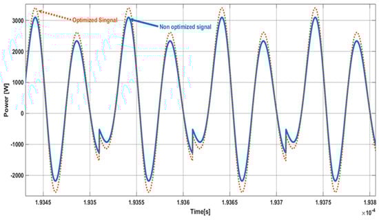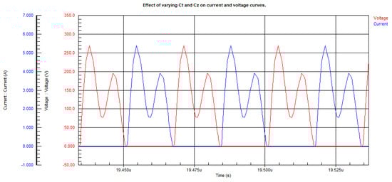 An optimization algorithm can be applied in this resonance impedance fine-tuning, which will enhance the performance and efficiency of the Class-Φ2 inverters. The process of fine-tuning endeavors to maximize the output power, Pout, is accessible through a wise change in the resonant impedance of the structure. For various reasons, this variation is directly relevant to the second harmonic of the output signal delivered by an inverter. Firstly, the algorithm reduces conduction losses by targeting the second harmonic component. Since the resistive elements in the circuit are responsible for conduction losses, minimizing these losses is a significant criterion for enhancing the global efficiency of the power converter. The next most important advantage of this optimization process is that it reduces the magnitude of the resonant current. Resonant currents will further increase power losses and thermal stresses in the components, influencing lifetime and reliability. To illustrate these current voltage patterns at the resistive load terminal, some typical examples are reproduced in Figure 19 and Figure 20. These examples prove how well-suited the optimization approach is for practical applications and how fine-tuning the resonance impedance is reached so that better performance can be obtained. The current–voltage curves allow the energy transfer to be more stable and efficient. It shows a decrease in the losses and an increase in the power output. Figure 18 contains currents and voltages before any optimization; supposedly, variations and inefficiencies existed. Figure 19 shows the optimized currents and voltages after the application of the optimization algorithm. The comparison between the two figures emphasizes that an excellent impedance-tuning strategy is necessary for inverter optimization. This optimization technique will take the performance of the inverter to an operating point wherein both stability and efficiency are preserved as the load is varied. The system continuously adjusts the resonant impedance and adapts to changes to keep the optimum power output for enhancing the whole performance and reliability of the Class-Φ2 inverters in practical applications.