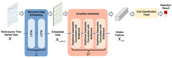 The overall structure of our abnormal detection model is shown in Figure 1; it contains recurrent data embedding, simplified MobileNet, and a cell classification head. The details of each component are demonstrated in the following section.