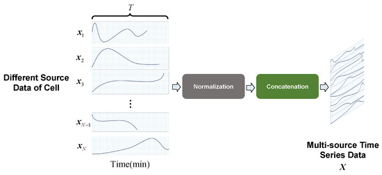 The process to form the multi-source time series data representation is shown in Figure 2. For a cell with N different data source, each data source , , is first normalized to . This can reduce the influence of the scales of different sources on the model performance. Then, the data sources with length less than T are padded with zeros for alignment, where T is the length of the longest source data. Finally, we concatenate these source data along the vertical direction to form the input multi-source time series data for the voltage-abnormal cell detection task.