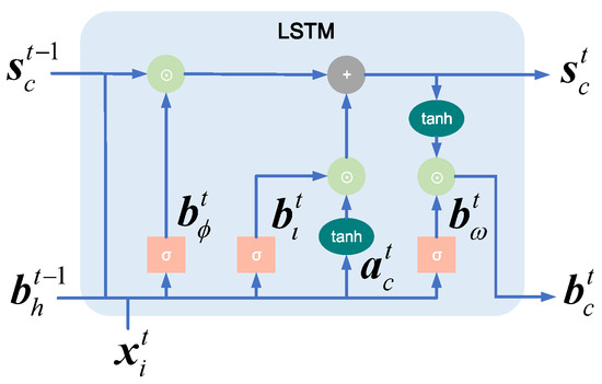 The recurrent data embedding module in our method is stacked with L LSTM [38,49,50] cells, as shown in Figure 1. The LSTM is a recurrent-based neural network which can handle long-term dependency in the sequence and is more efficient than RNN for time series data. There are many variants of LSTM for different applications. In this paper, we adopted the model structure from [38] for the voltage-abnormal cell detection task, which is easy to train and less complex. The details of the LSTM cell are shown in Figure 3. The calculation of the LSTM cell is as follows: